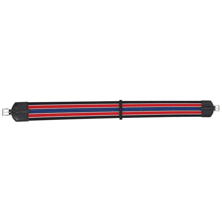 Zilco heavy duty elastic race girth in red/blue stripe. This model is made from heavy 75mm wide elastic with 19mm stainless steel buckles at each end. Includes a centre loop to keep the surcingle in place.