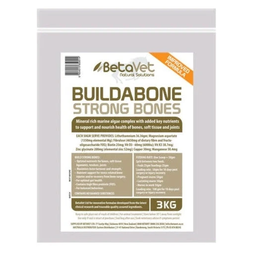 BUILDABONE provides nutritional support for bone growth and bone turnover, mineral deposition and maturation for superior bone and hoof strength, particularly in growing young stock. Derived from unique calcareous marine algae (lithothamnium) and combined with additional bone health minerals,