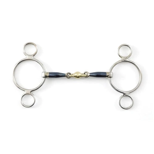The centre of this bit features an anatomical brass alloy lozenge that helps distribute even pressure over both the tongue and bars of the mouth, encouraging mouthing and contact. The blue sweet iron mouthpiece oxidizes easily, creating a warming sensation and a sweet taste in the horse’s mouth, which helps them accept the bit. Please note that the blue color will fade with use, which is normal. This bit is double-jointed and has a moderate bit strength, making it ideal for experienced riders. However, it is important to note that this bit is NOT BD Legal.