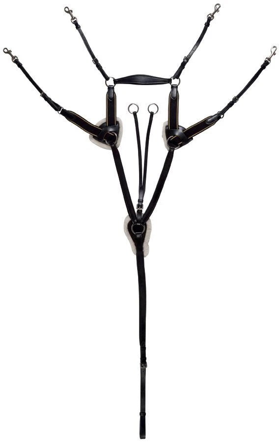 The Jeremy and Lord Five Point Breastplate combine exceptional quality with value. It will satisfy the needs of the most discerning equestrian. Handcrafted by skilled artisans that are trained in the best British tradition. The handcrafted drum dyed leather is supple and softens immediately. It features the five point style with padded leather breast plate elastic inserts and decorative stitching. It also features removable martingale rings, two saddle points at each side. The top saddle point has snap hooks for easy use and there is an equalising elastic setup for full adjustment.