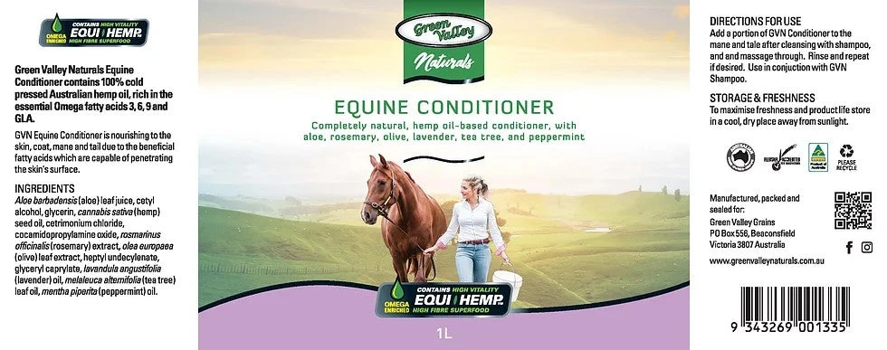 Green Valley Naturals Equine Conditioner contains 100% cold pressed Australian hemp oil, rich in the essential Omega fatty acids 3, 6, 9 and GLA.