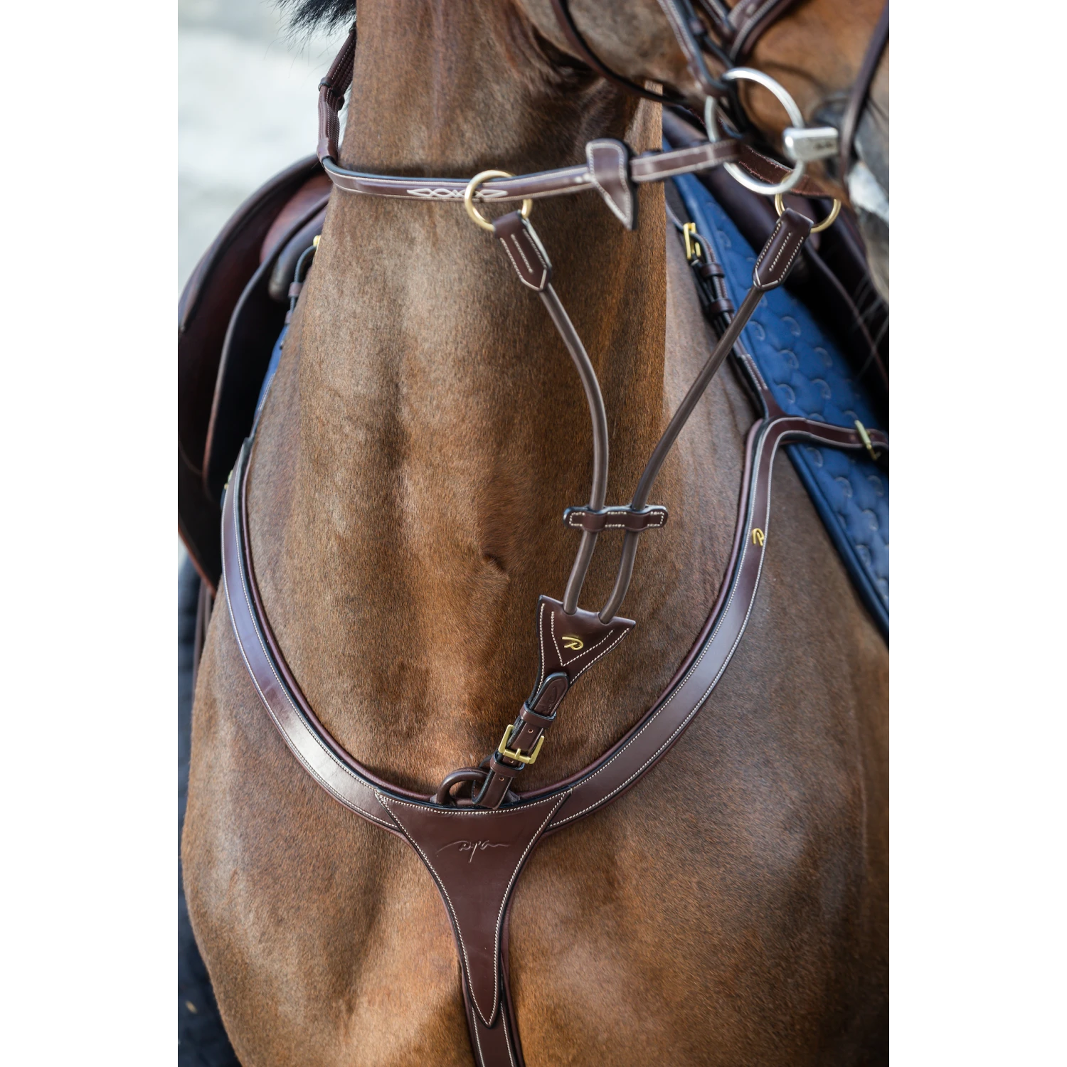 This elastic running martingale attaches to a yoke or breastplate by a roller buckle.