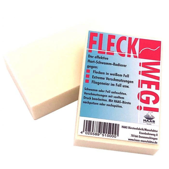 Very effective hard sponge for heavily soiled coats, stains on white coats, insect eggs nested in the coat. Damp sponge or coat, then clean with gentle pressure. Rinse or groom with a HAAS brush.