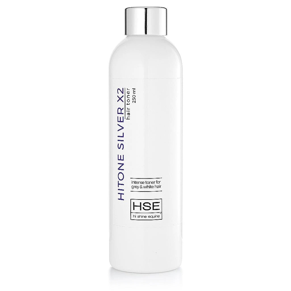 HSE HiTone Silver X2 is a salon formula, ultra-concentrated toning solution for grey & white horses. It is a simple, quick and extremely effective way to neutralise the brassy yellowing left in mane, tail & body hair after washing. HiTone Silver won’t remove grass, manure & urine stains but it will colour correct grey and white hair after shampooing or stain removal leaving the hair ultra-white with sparkling silvery highlights. Regular use will help prevent stains penetrating the hair cuticle.