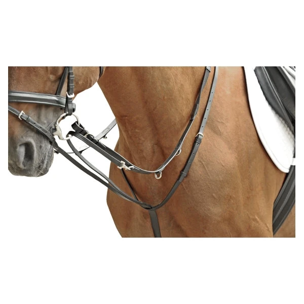 • The martingale consists of a neck strap with two adjustable straps which go through the bit and snap onto the D’s on the reins.