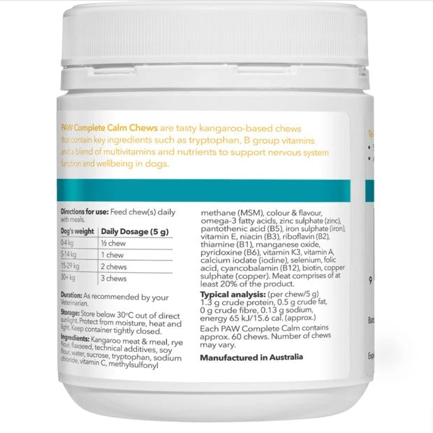 PAW Complete Calm Chews are available in a 300 g tub. Each tub contains approximately 60 chews.
