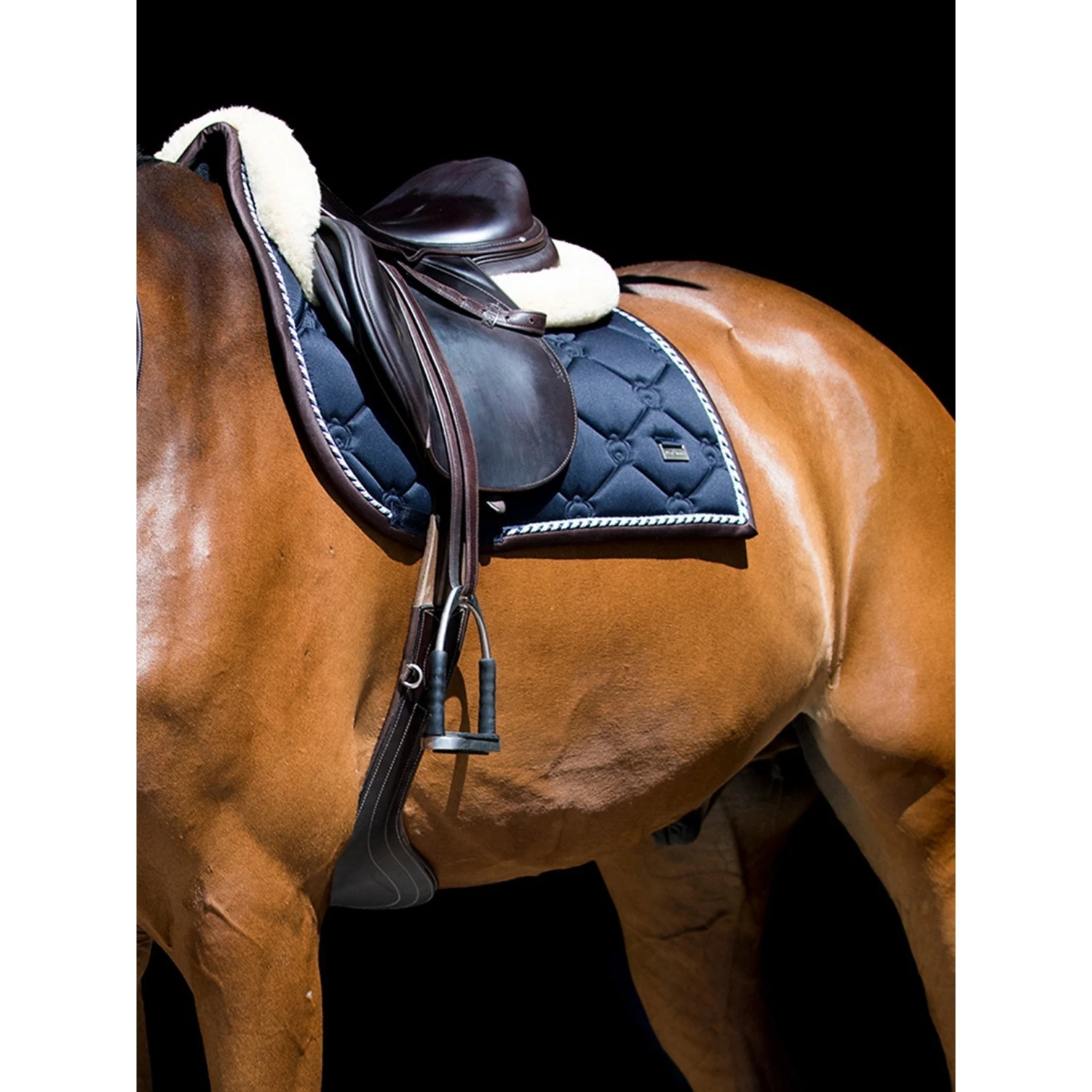 Anatomical saddle pad with double piping and the PS of Sweden crown embroidered in a luxurious monogram pattern. For extra comfort, there are unique stop cushions that keep the saddle pad in place and avoids friction. The inside is provided with an antibacterial quick-dry material that helps to transport moisture and sweat away.