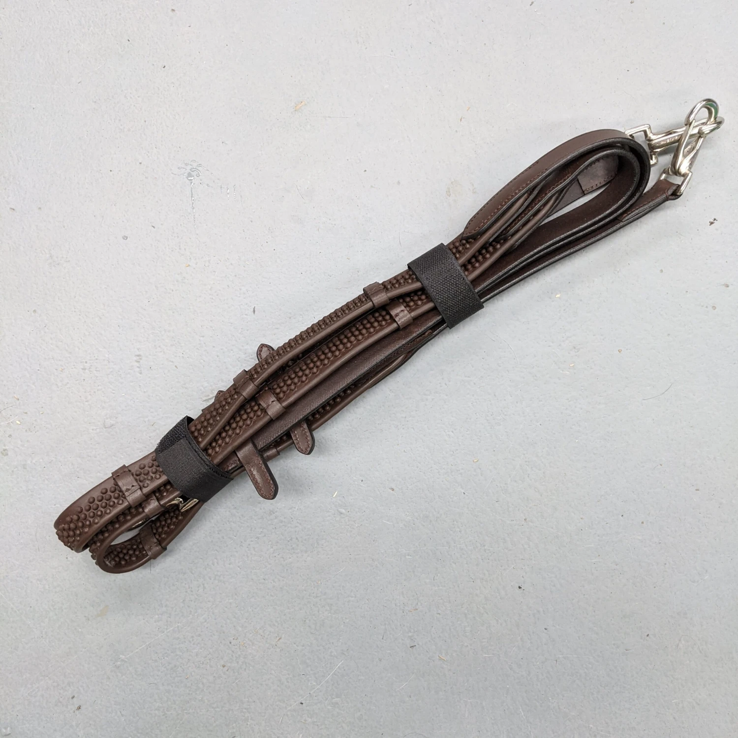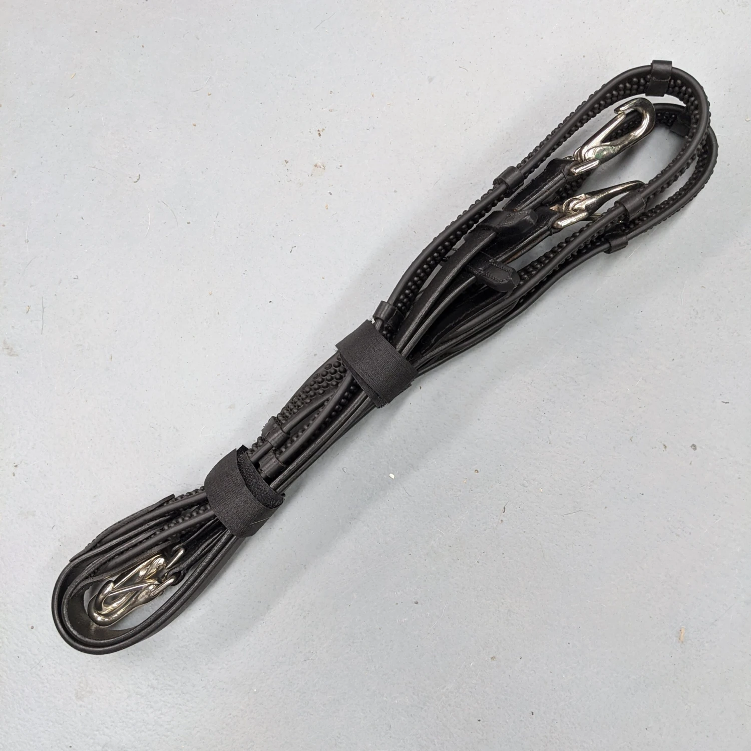 Rubber grip reins with leather billets and with clips to attach to the bit and also to each other where normally buckles would be. Make taking your reins on and off simple with these clips!