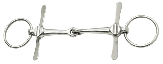 Stainless Steel with loose rings. The wings not only prevent the bit from being pulled through the horse’s mouth, but exert lip pressure when the reins are used.