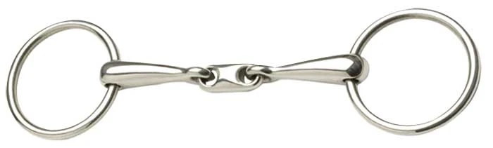 Fine mouth stainless steel ring bit with lozenge shaped joint that sits flat on the tongue with rein pressure.